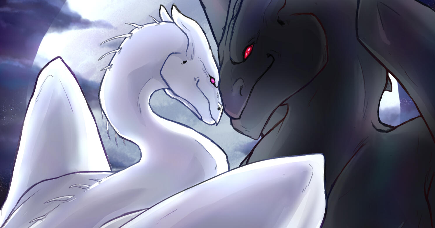 This dragon’s imagery was inspired by a handful of different things - primarily calligraphy brushes strokes and vitiligo. The egg was inspired by binary stars and the interplay between their gravitational fields.
