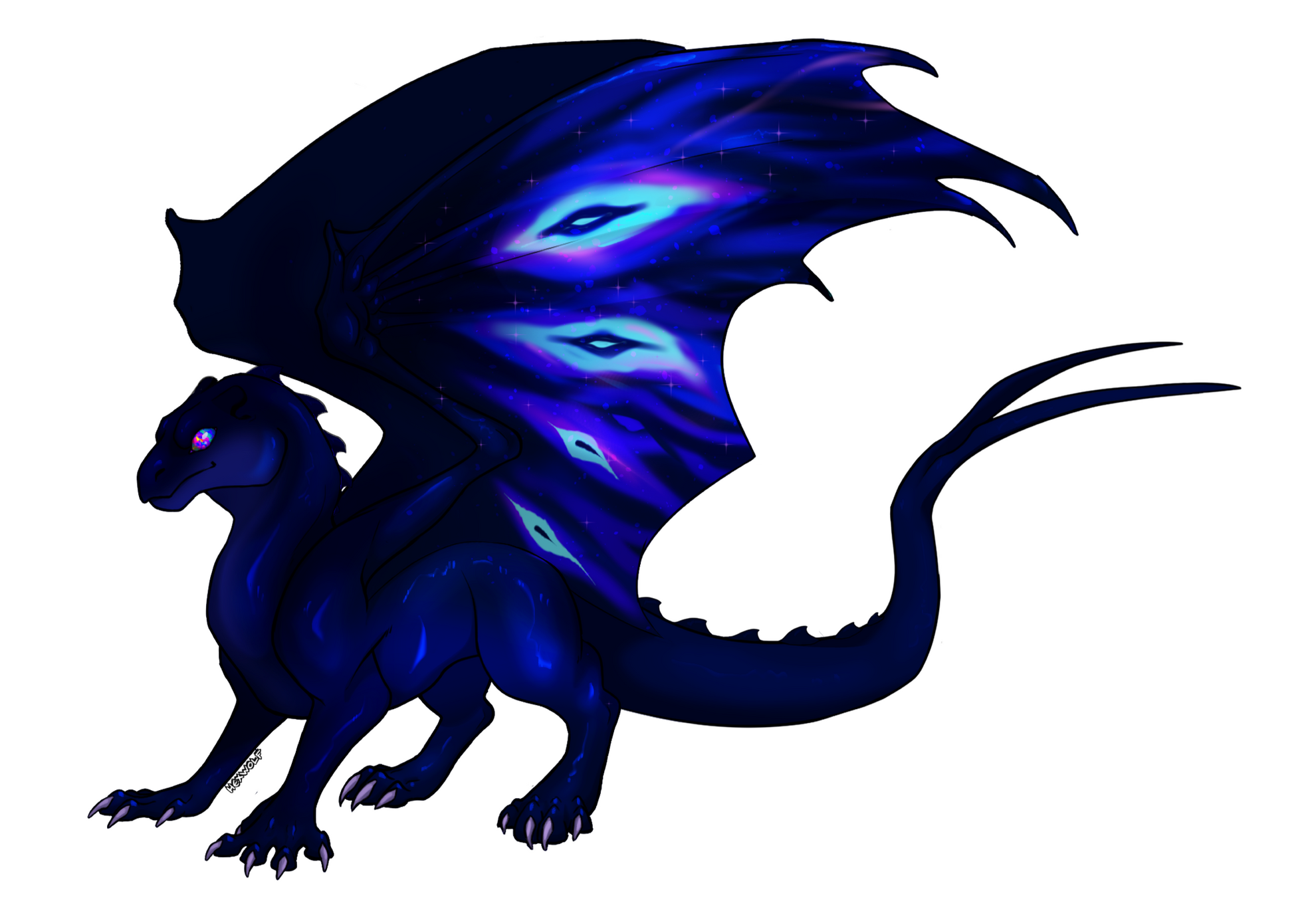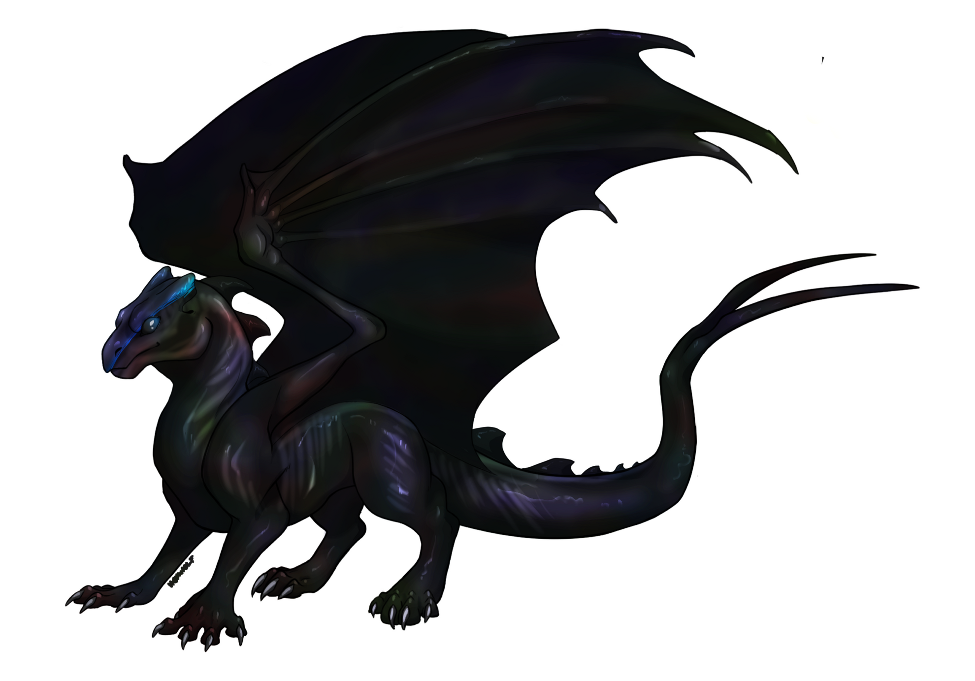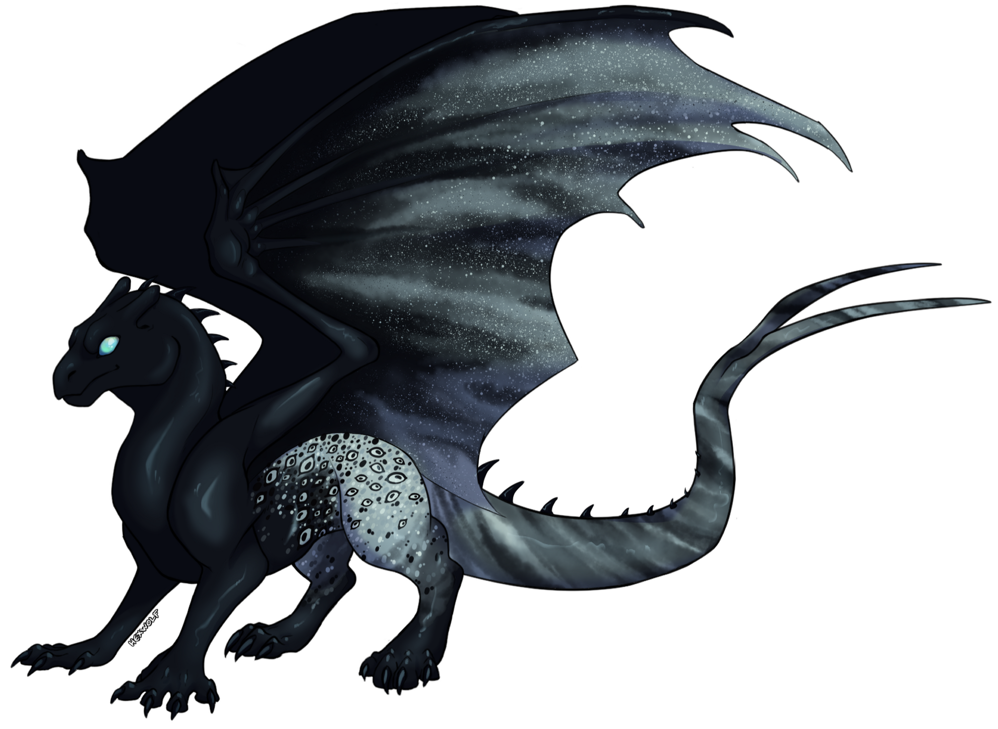 Yvaith is predominantly pitch black, so dark in colouration as to seemingly absorb the light and colour from her surroundings even in the brightest of environments. The sleek black of her hide is broken by patterns of grey and white, mottling from her waist gradually until the paler colours encompass her entire hindquarters and tail. The spotted patterning along her latter half seem at a glance to be simple dots of colouration, but on closer examination reveal themselves to be countless ever staring eyespots. Her tail is long and whip-like, and banded with asymmetrical daubs of blacks, whites, and greys.Yvaith is a curious creature, seemingly built entirely for flight with her broad and powerful shoulders and deep, barrel chest that taper into a slender and aerodynamic hind end. Her wings are massive and upon hatching very ungainly with her size, being both broad and long, and dwarfing her body in size. Her spines are long and needle-like, and near flat when viewed head-on to better cut through the air, and her headknobs are a similarly long and thin affair.