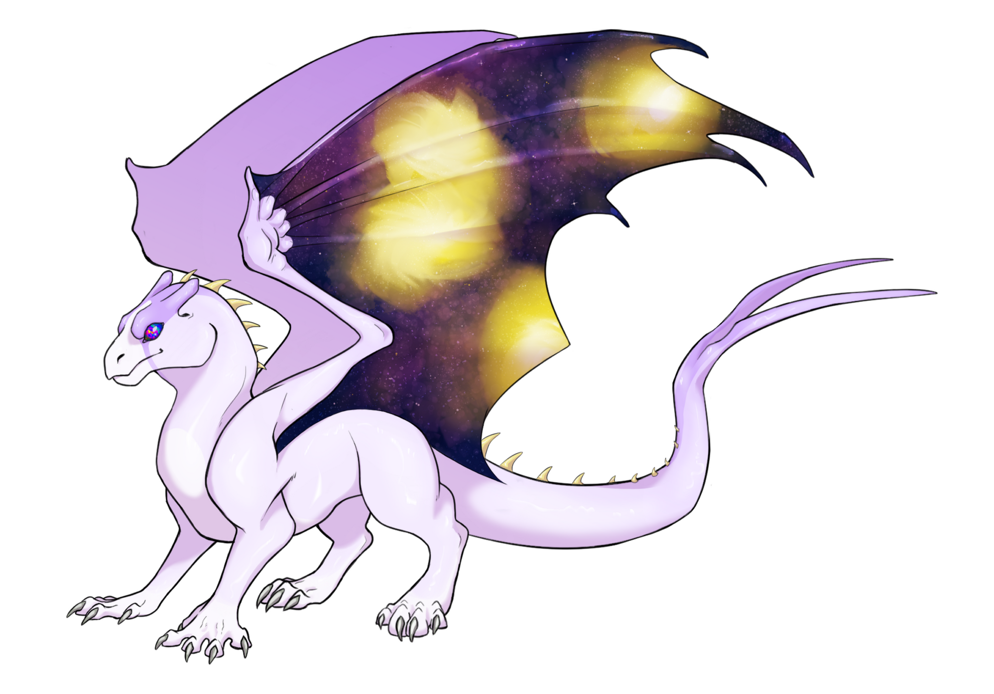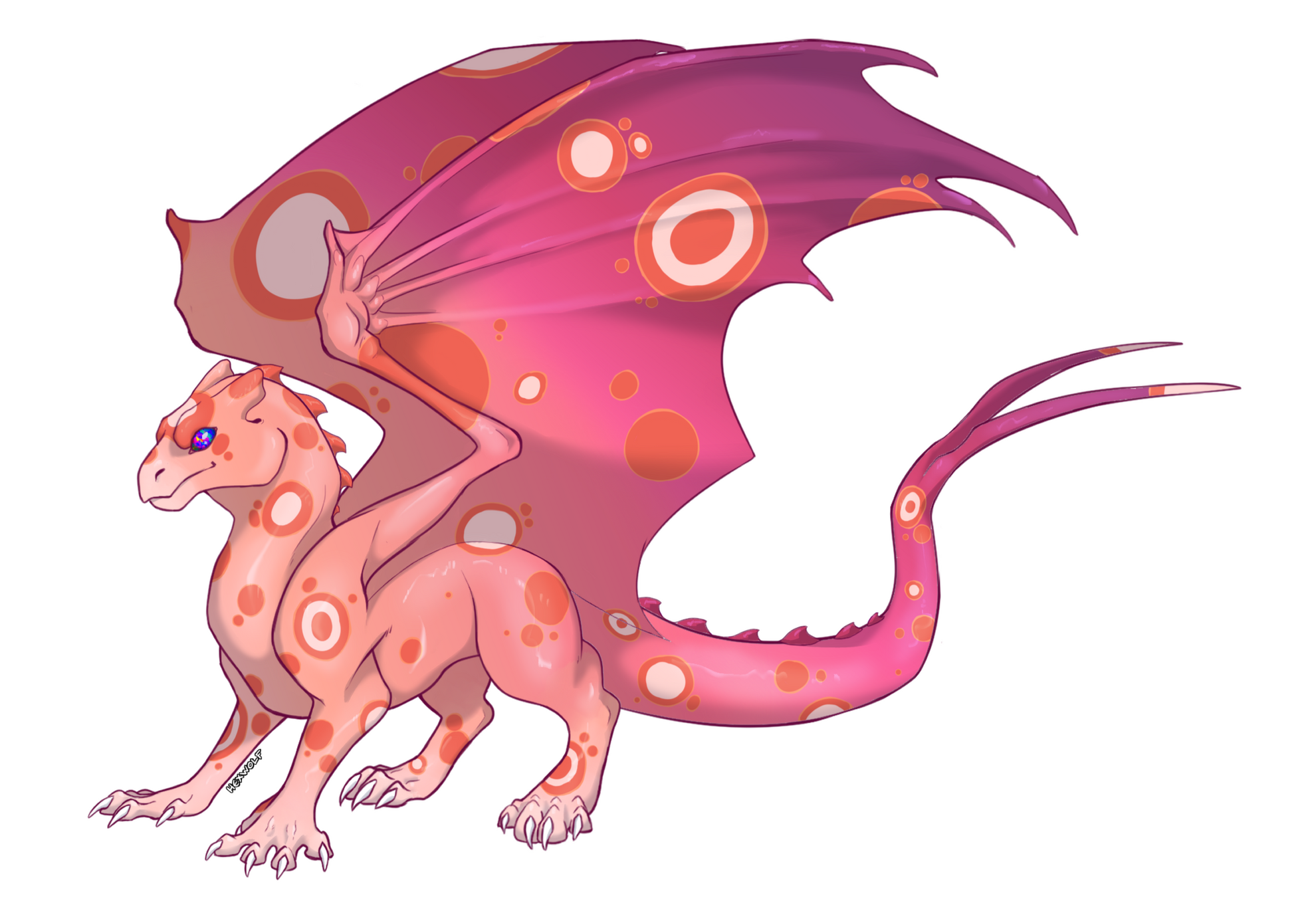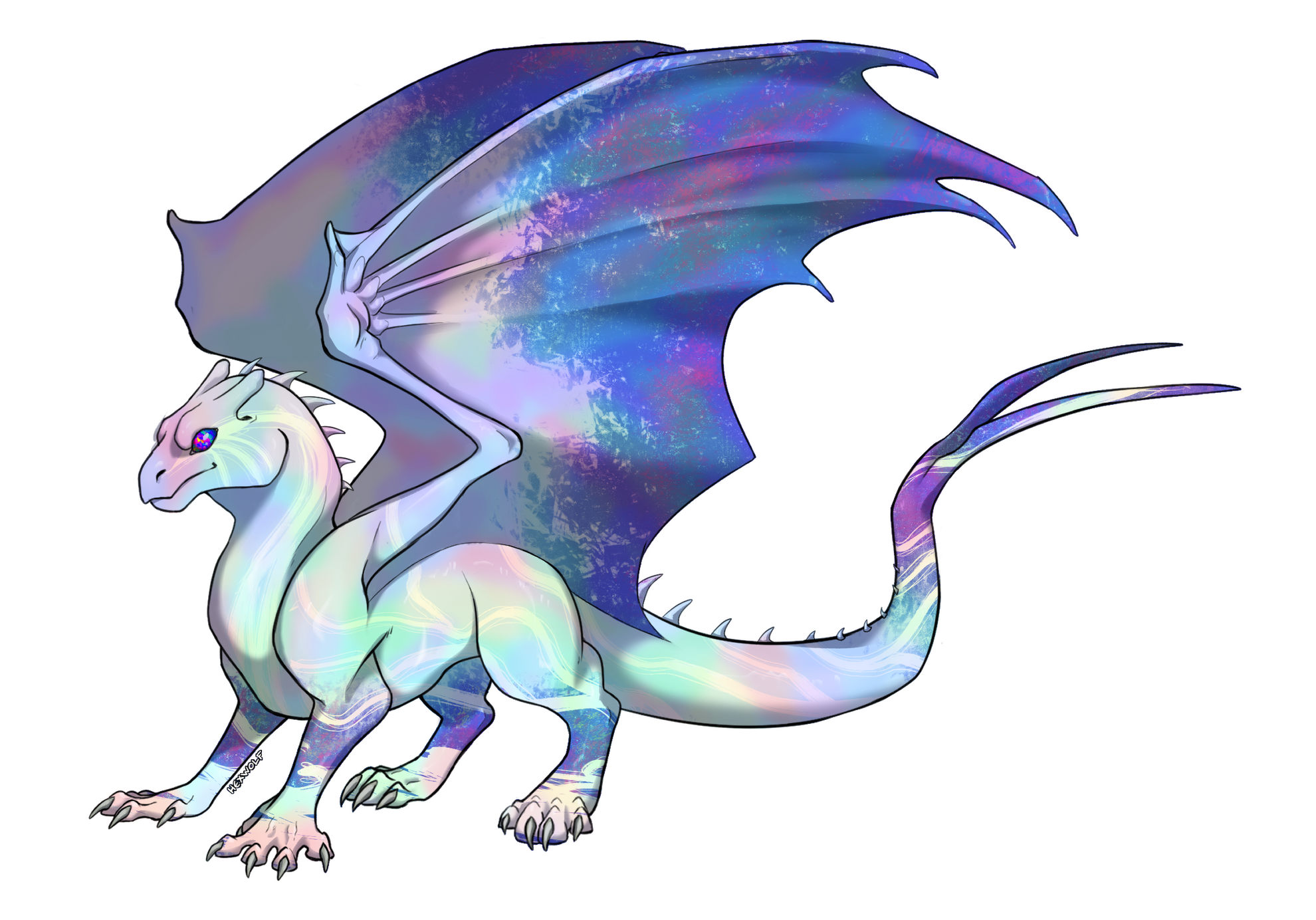 Yvaith is predominantly pitch black, so dark in colouration as to seemingly absorb the light and colour from her surroundings even in the brightest of environments. The sleek black of her hide is broken by patterns of grey and white, mottling from her waist gradually until the paler colours encompass her entire hindquarters and tail. The spotted patterning along her latter half seem at a glance to be simple dots of colouration, but on closer examination reveal themselves to be countless ever staring eyespots. Her tail is long and whip-like, and banded with asymmetrical daubs of blacks, whites, and greys.Yvaith is a curious creature, seemingly built entirely for flight with her broad and powerful shoulders and deep, barrel chest that taper into a slender and aerodynamic hind end. Her wings are massive and upon hatching very ungainly with her size, being both broad and long, and dwarfing her body in size. Her spines are long and needle-like, and near flat when viewed head-on to better cut through the air, and her headknobs are a similarly long and thin affair.