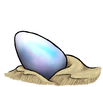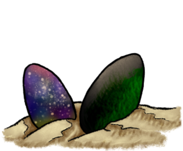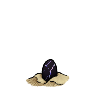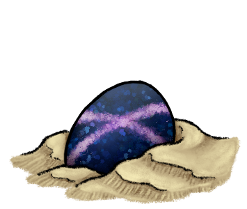 The darkness that covers this egg's surface is shattered by glittering veins of opal that spider through it. Each of these marbled trenches sparkles with a pale, subtle rainbow that shines in sharp contrast to the void it runs through. It rests in the sands as a perfectly broken pearl, small in comparison to its siblings but distinct in its eagerness. From the moments of its laying, it shows a desire to hatch and present its contents to the light of the world. A longing that even the dark depths of its shell cannot hide.