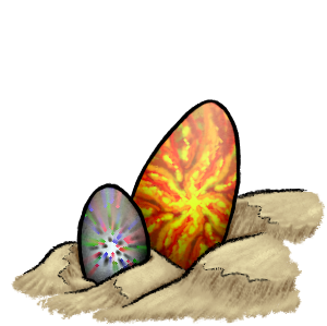 Large and loud, the Primordial Roar Egg is yellow, orange, red, the colors of fire and sunrise and passion. Painted on its shell is a tremendous starburst, a visual roar of beginning, being, dying; the egg is forever leaning one way or the other as if reaching, and even past the bounds of its shell this dragonet-to-be's presence can scald anyone walking by. But its temperament isn't angry – Primordial Roar is if anything elated, but its joy is simply too awesome to withstand.