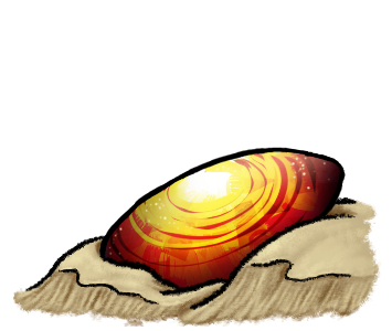 Neither particularly large nor small, this egg sits low in the sand, giving it an air of both heft and warmth. Soft radiance washes over this egg’s shell, a swirling cascade of creams and yellows and gold that stand out from its many darker brethren. The colors form an unmistakable spiral, steadily growing looser and melting together in warm streaks of orange and red as they spread out. As the spiral tightens it grows brighter, almost glowing until it reaches the core: a small, blurry patch high off on the egg’s side. Plain white in color, it gives the egg an almost unfinished look, empty of its most pivotal piece.