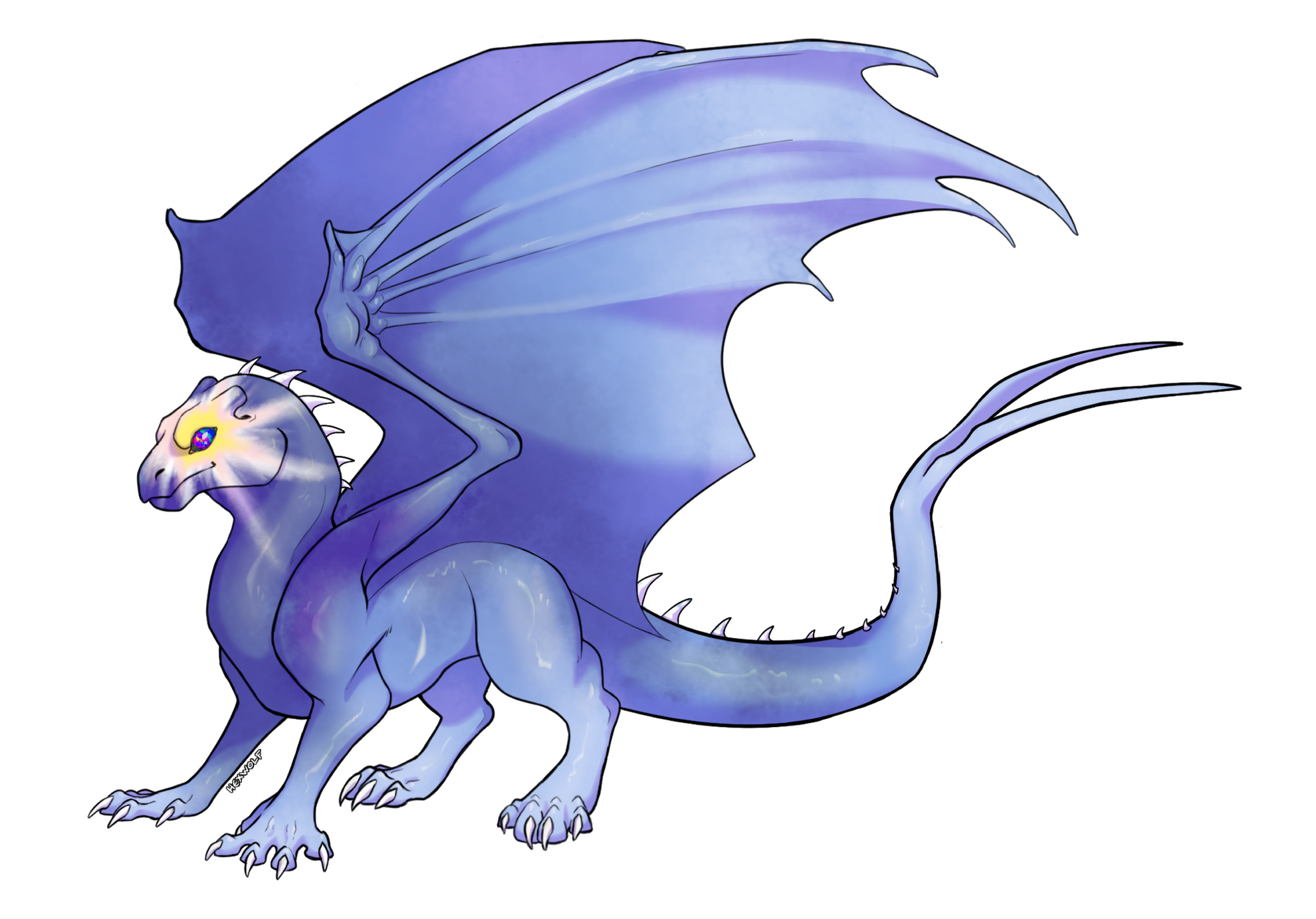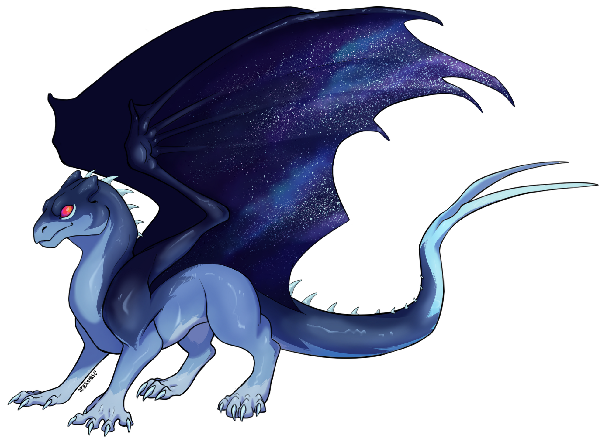 Siriuth is a long and willowy creature, they are thicker around their chest and shoulders but otherwise they are built lean and rangy with a long, slender tail. Their head is narrow and tapered, widest at their jaw with a lengthy and slim snout. Their spines and claws are long and wicked, but just as narrow and streamlined as the rest of them. Their wings are likewise streamlined, long and pointed in their shape; they are designed to carry them at great speeds in intense bursts, to change direction quickly in the air, and to hover easily when aloft.Siriuth’s blue hide is a soft, lighter shade over most of their body, with a cape of darker blue over their back and wings. They sport some paler accents of blue on their feet, belly, and the tip of their tail, as well as a small white-blue daub beneath their eyes. Their spines and claws are likewise pale, almost white. When their wings are unfurled the relatively plain dark colouration along their back melts into cloudy patterns of blues, purples, and teals, with pale speckles like stardust streaking towards the edges of their wings, evoking a vision of a clear night sky.